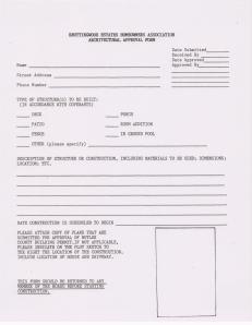 An Architectural Review Form should be submitted before starting construction on a patio, fence, porch, room addition, in-ground pool, or any new construction. Click on the title of this post for a copy of the form or go to Architectural Review Form to submit online.