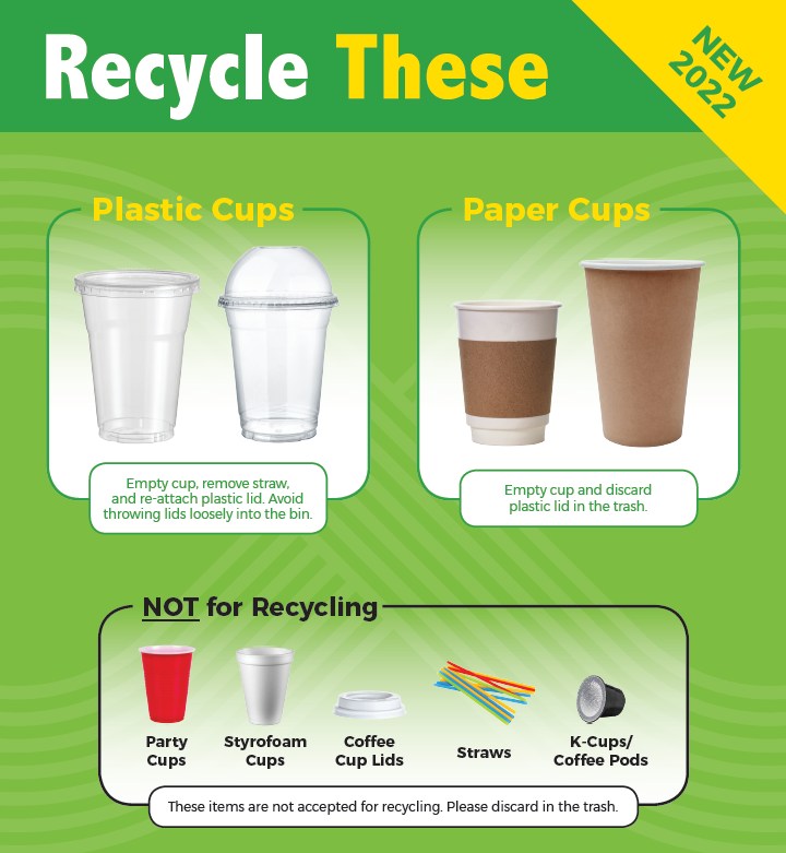 Rumpke now accepts paper coffee cups and plastic cold drink beverage cups for recycling! Discard plastic lid from paper coffee cup before recycling. See details below.